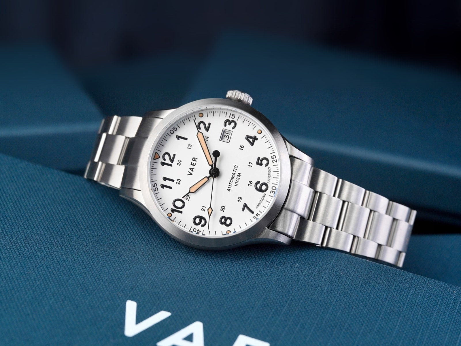 SUMMARY The A5 Field White is a military-inspired 10ATM watch, that stands out in the Vaer line-up thanks to its classic field watch design. As an A5 model, this watch is part of our automatic field collection, distinguished by its ocean-ready functionality, low-profile case design, ultra-slim self-winding movement, and full USA assembly.