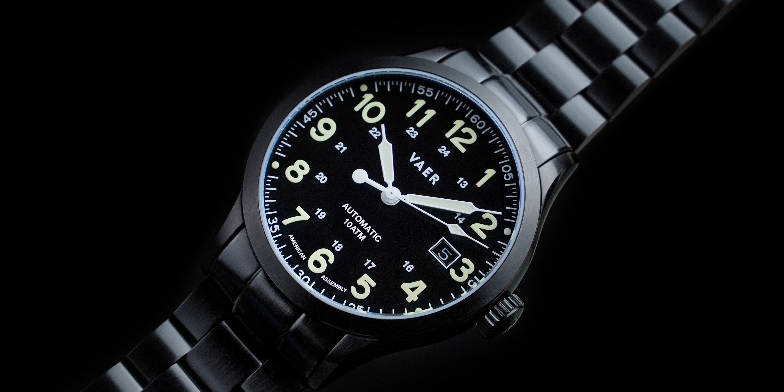 SUMMARY The A5 Tactical Field is a military-inspired 10ATM watch, that stands out in the Vaer line-up thanks to its "blacked-out" aesthetic and extremely impressive lume paint performance. As a A5 model, this watch is part of our automatic field collection, distinguished by its ocean-ready functionality, low-profile case design, ultra-slim self-winding movement, and full USA assembly.