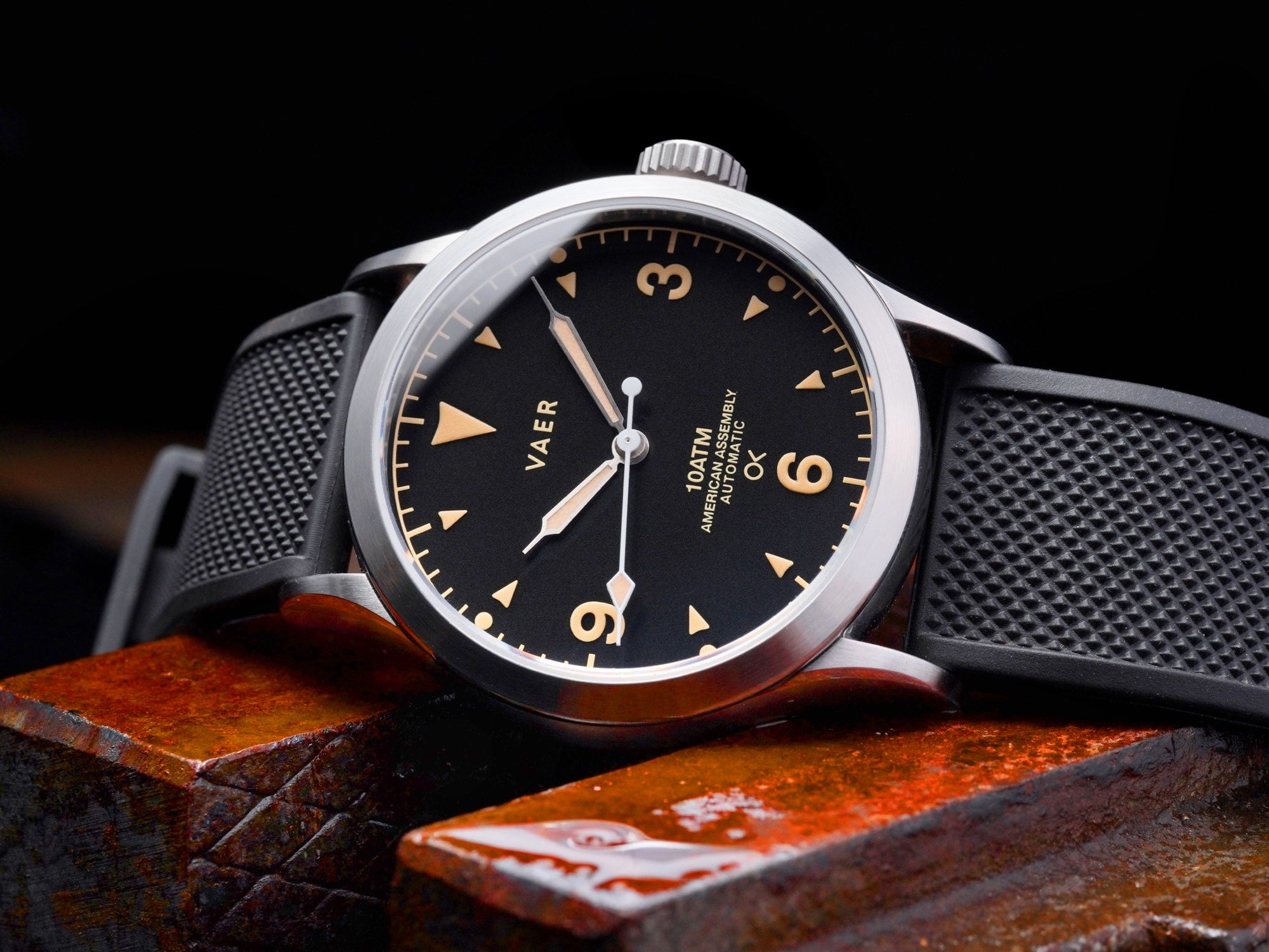 The Vaer DS2 Diver is our most affordable dive watch, combining classic tool-watch design with 150 meters of water resistance, a screw-down crown—all in a compact, adventure-ready package.