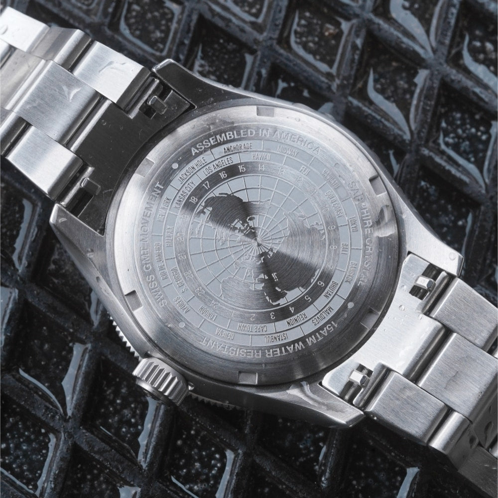 The G2 GMT watch features an intricately etched world time zone map on the caseback, adding both style and function. This unique detail enhances the travel experience, making it easy to keep track of global time zones at a glance.