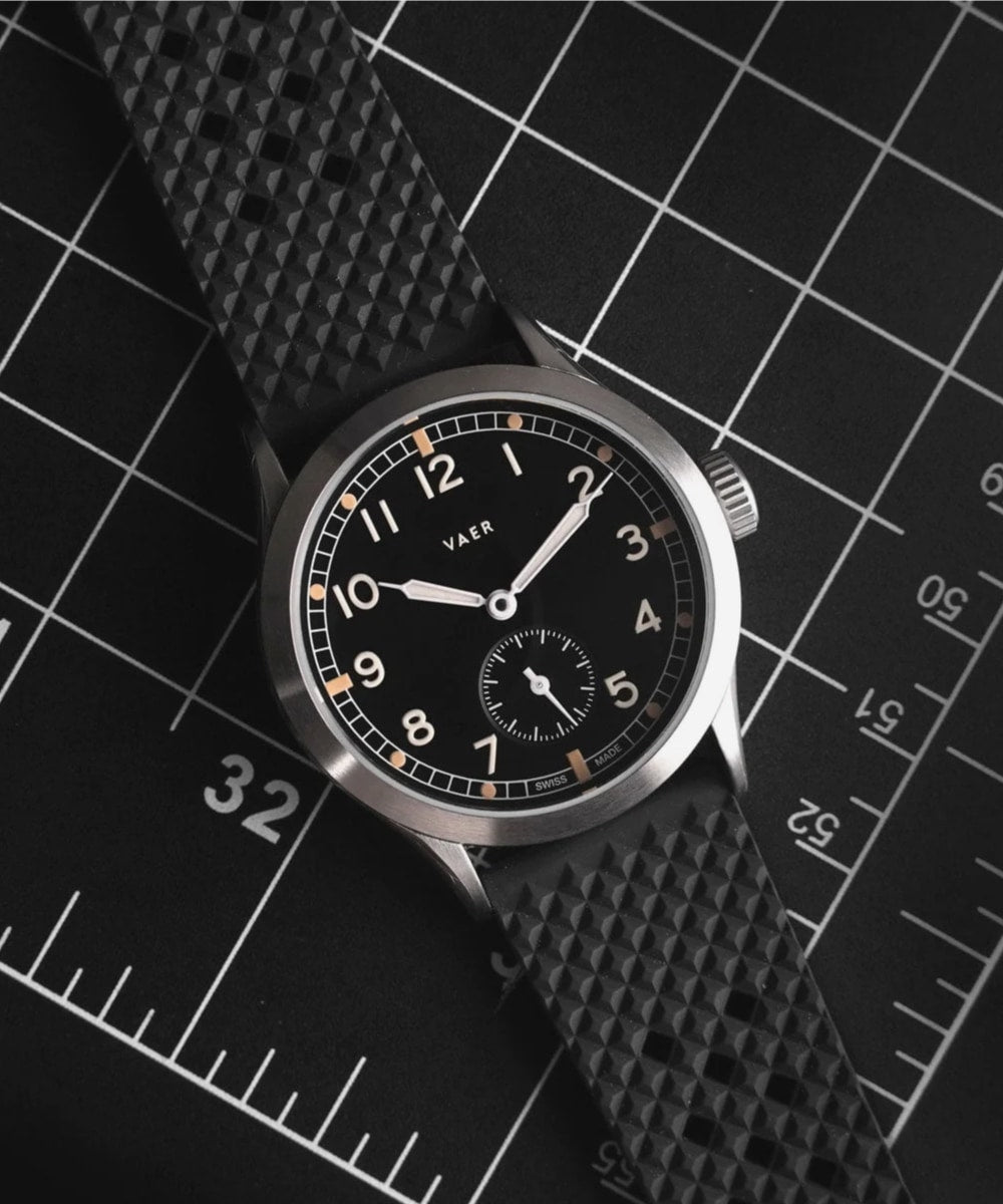 "In designing the D4 Meridian our goal was to pay homage to the history of military dive watches while also further establishing a distinct and modern Vaer aesthetic. This watch's dial design and bezel are inspired by Rolex and Doxa military divers from the 1970s - and the case is inspired by the military issue Omega Seamaster."
