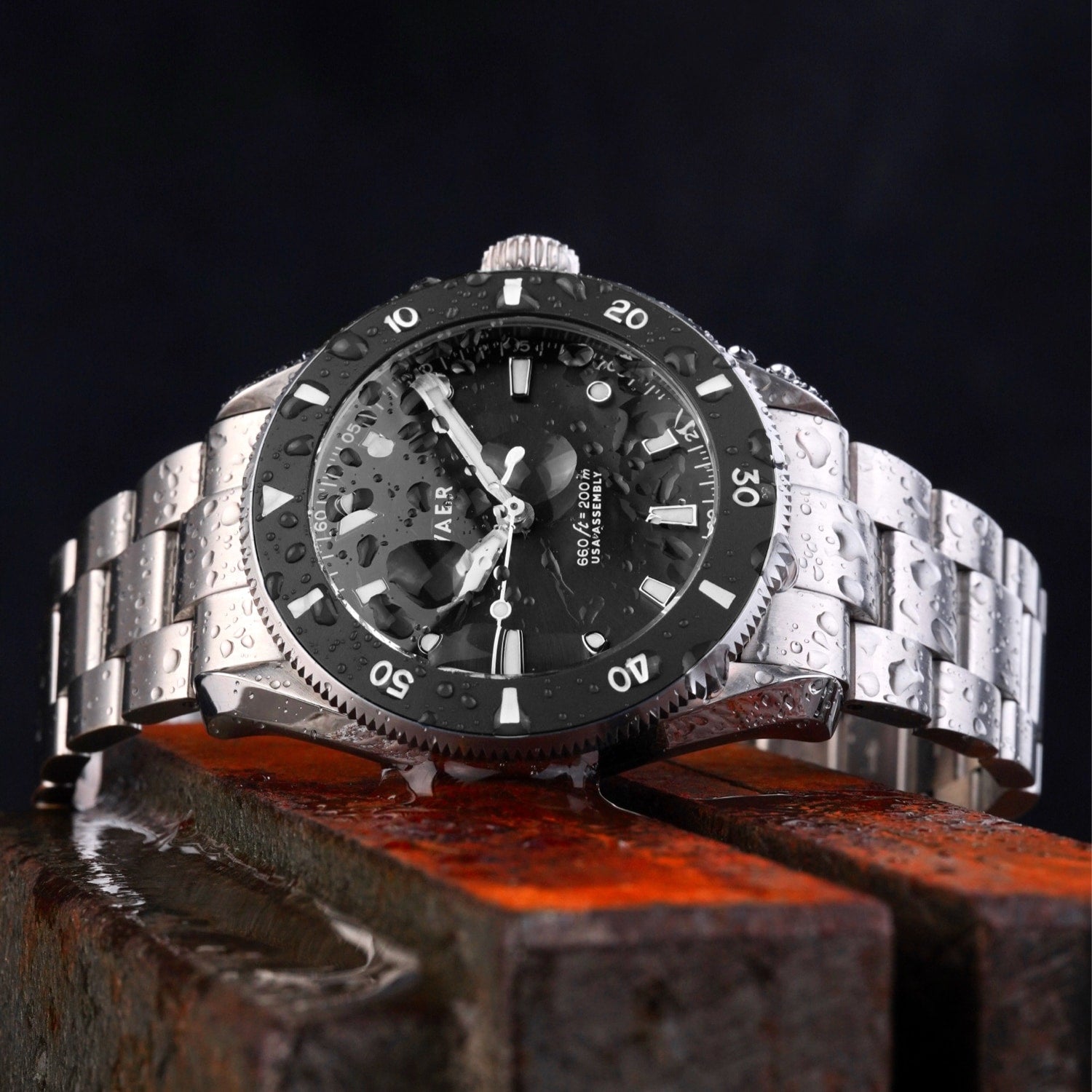 Our watches are built with durability and versatility in mind, featuring premium components like screw-down crowns and case backs and robust gaskets to ensure reliable performance in and out of the water.