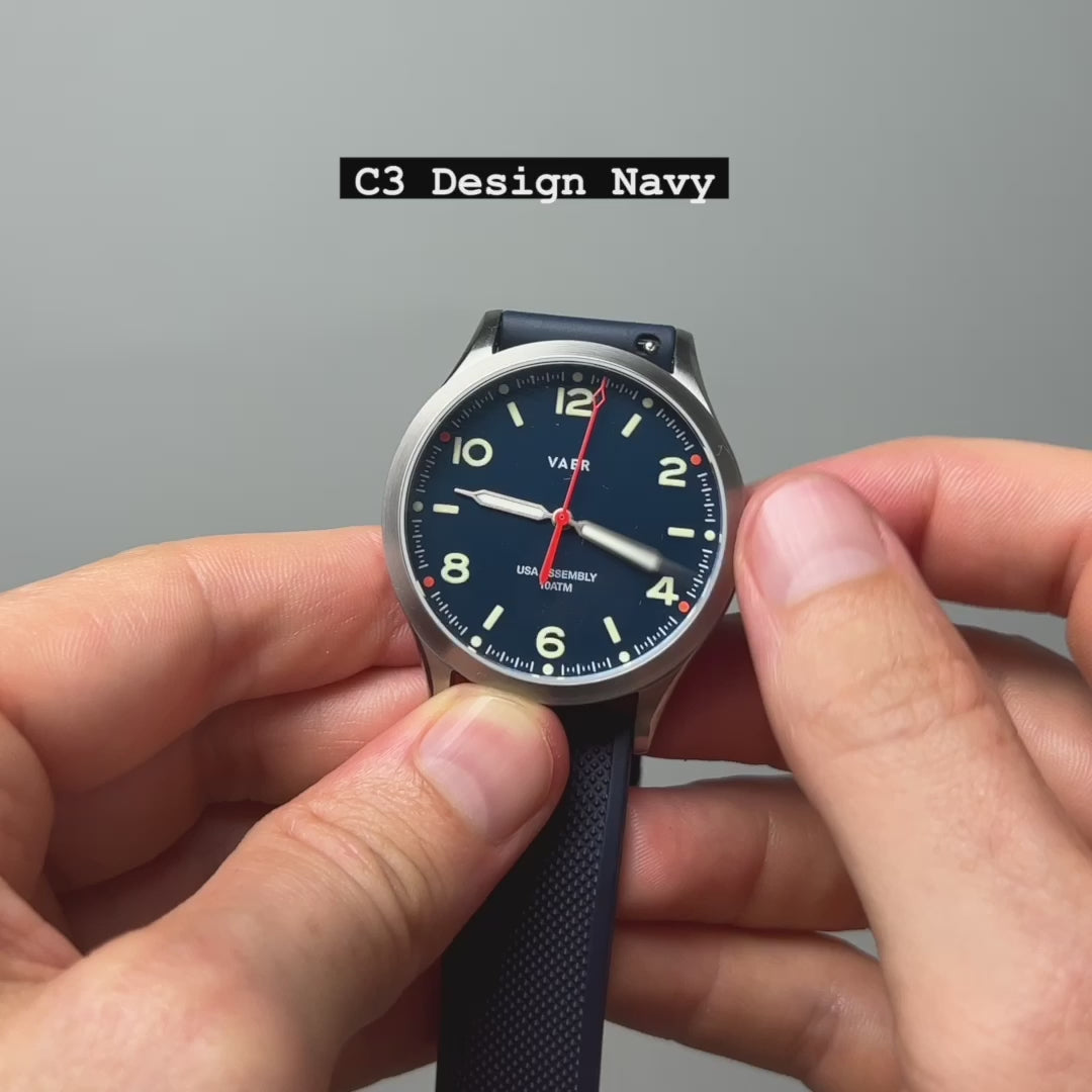 SUMMARY: This is the new solar-powered version of our popular Design Navy field watch, which was first introduced into the Vaer lineup in 2019. Why have we transitioned to solar? In our opinion, solar movements provide the best of both worlds - perpetual timekeeping with incredible accuracy. Six hours of sunlight will provide six months of power reserve, and the watch can run off any light source (even candlelight). In terms of aesthetics, the C3 Design Navy stands out in the Vaer line-up thanks to its excellent balance between Bauhaus minimalism, and rugged outdoor functionality. As a C3 model, this watch is part of our all-time bestselling collection, distinguished by its ocean-ready functionality, low-profile case design, ultra-accurate solar quartz movement, and full USA assembly.