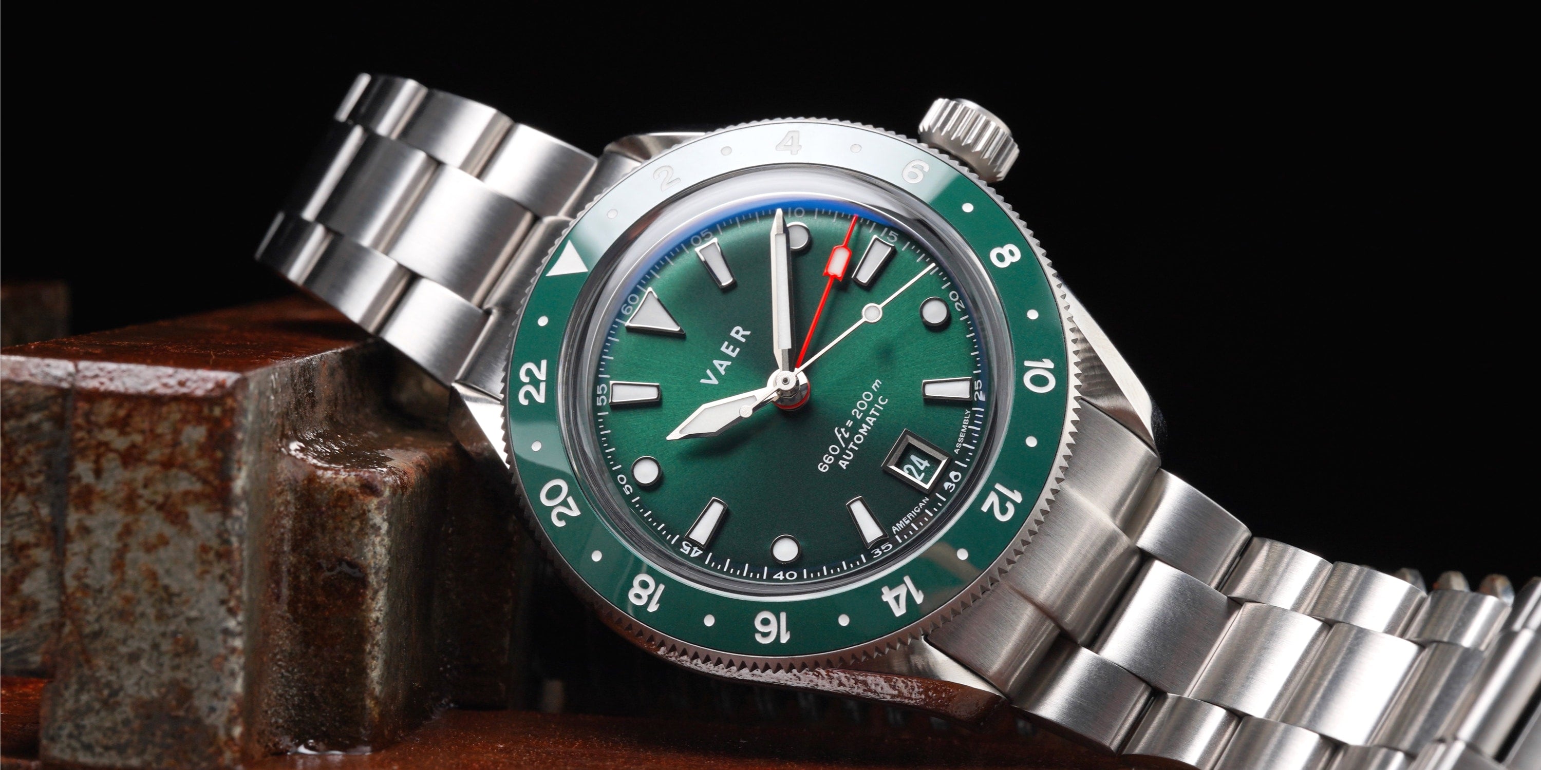 SUMMARY The second-generation G5 Meridian is a 1950s-inspired 20ATM automatic watch that stands out in the Vaer line-up as our most premium USA-assembled model and our only true GMT. As a G-series model, this watch is part of our dual timezone automatic series, distinguished by its ocean-ready functionality, self-winding movement, and full American assembly.