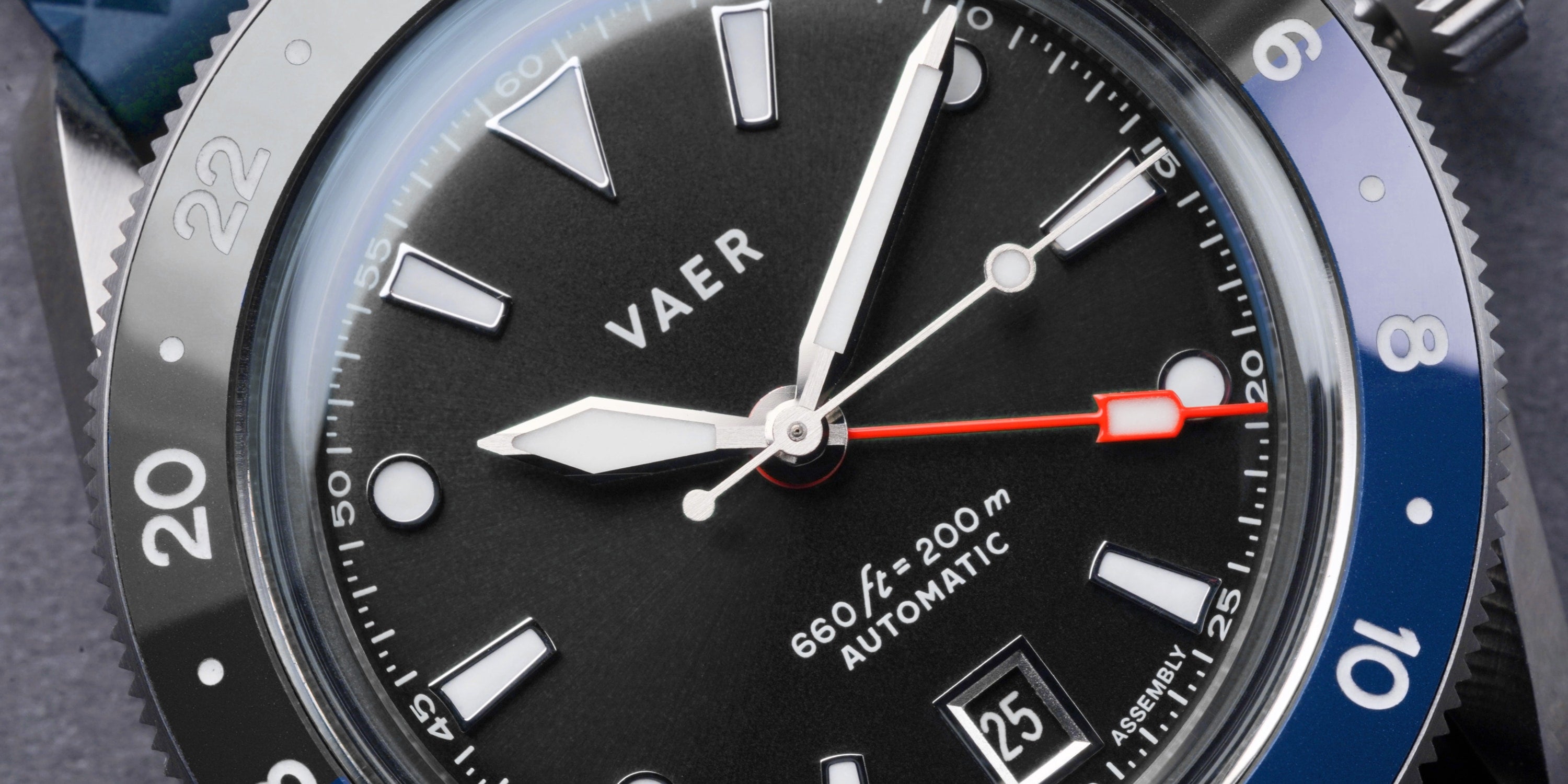 INSPIRATION The G5 Meridian is the GMT version of the Meridian diver (our core dive watch design). In designing that watch, our goal was to pay homage to military history while also further establishing a distinct and modern Vaer aesthetic. This watch's dial design is inspired by the 1970s Rolex Milsub and 1950s GMT Master, worn by American Pan Am pilots in the early days of commercial aviation. The dial features Vaer’s distinctive curved trapezoid indices, and round dots at the 2, 4, 8, 10, (another hallmark of Vaer dials). The G5 GMT is further distinguished as one of the only Vaer model to use Grade A BGW9 lume paint - the feature that helps it achieve such an incredible night-time glow.