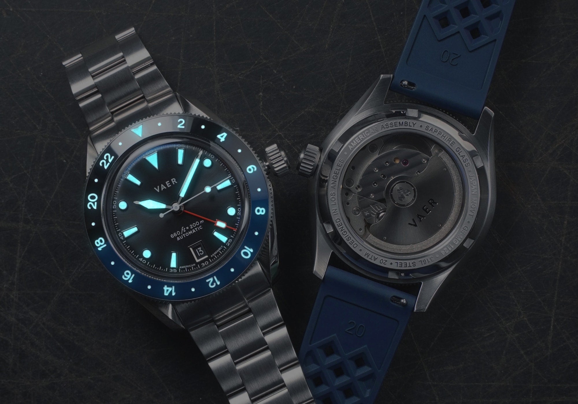SUMMARY The second-generation G5 Meridian is a 1950s-inspired 20ATM automatic watch that stands out in the Vaer line-up as our most premium USA-assembled model and our only true GMT. As a G-series model, this watch is part of our dual timezone automatic series, distinguished by its ocean-ready functionality, self-winding movement, and full American assembly.
