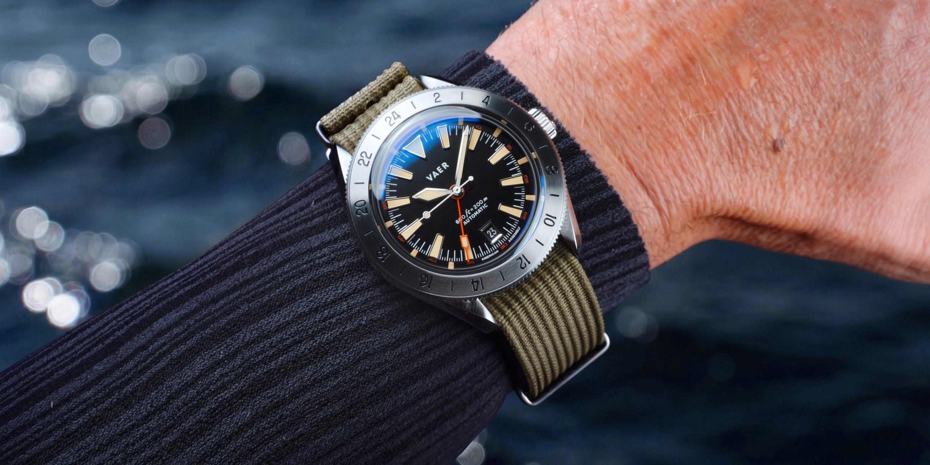 SUMMARY The G5 Pacific is a 1950s-inspired 20ATM automatic watch that stands out in the Vaer line-up as our most premium USA-assembled model and our second automatic GMT. As a G-series model, this watch is part of our dual timezone automatic series, distinguished by its ocean-ready functionality, self-winding movement, and full American assembly.