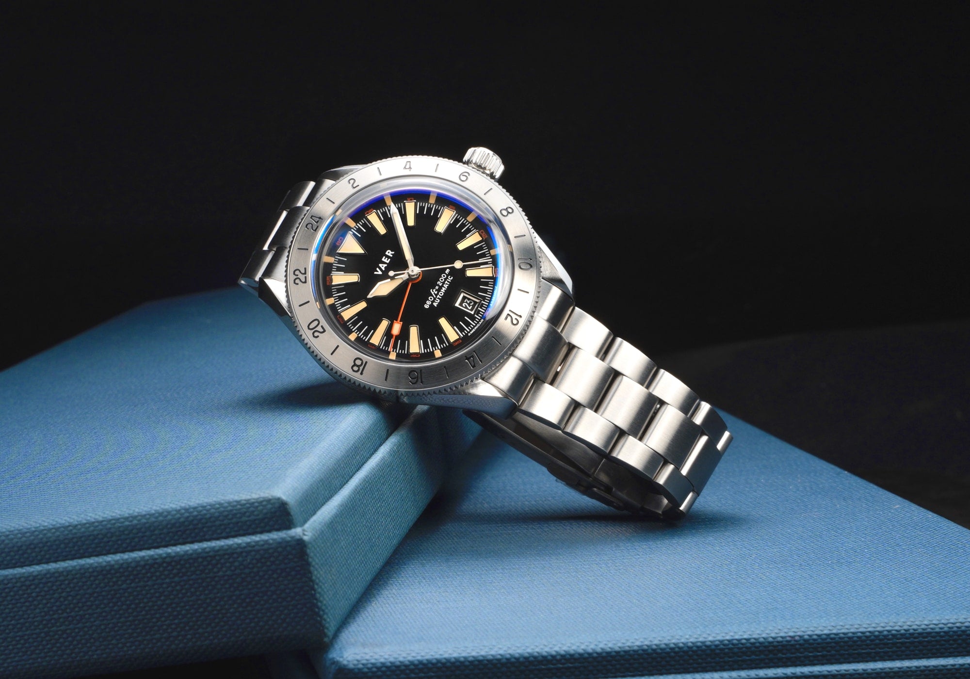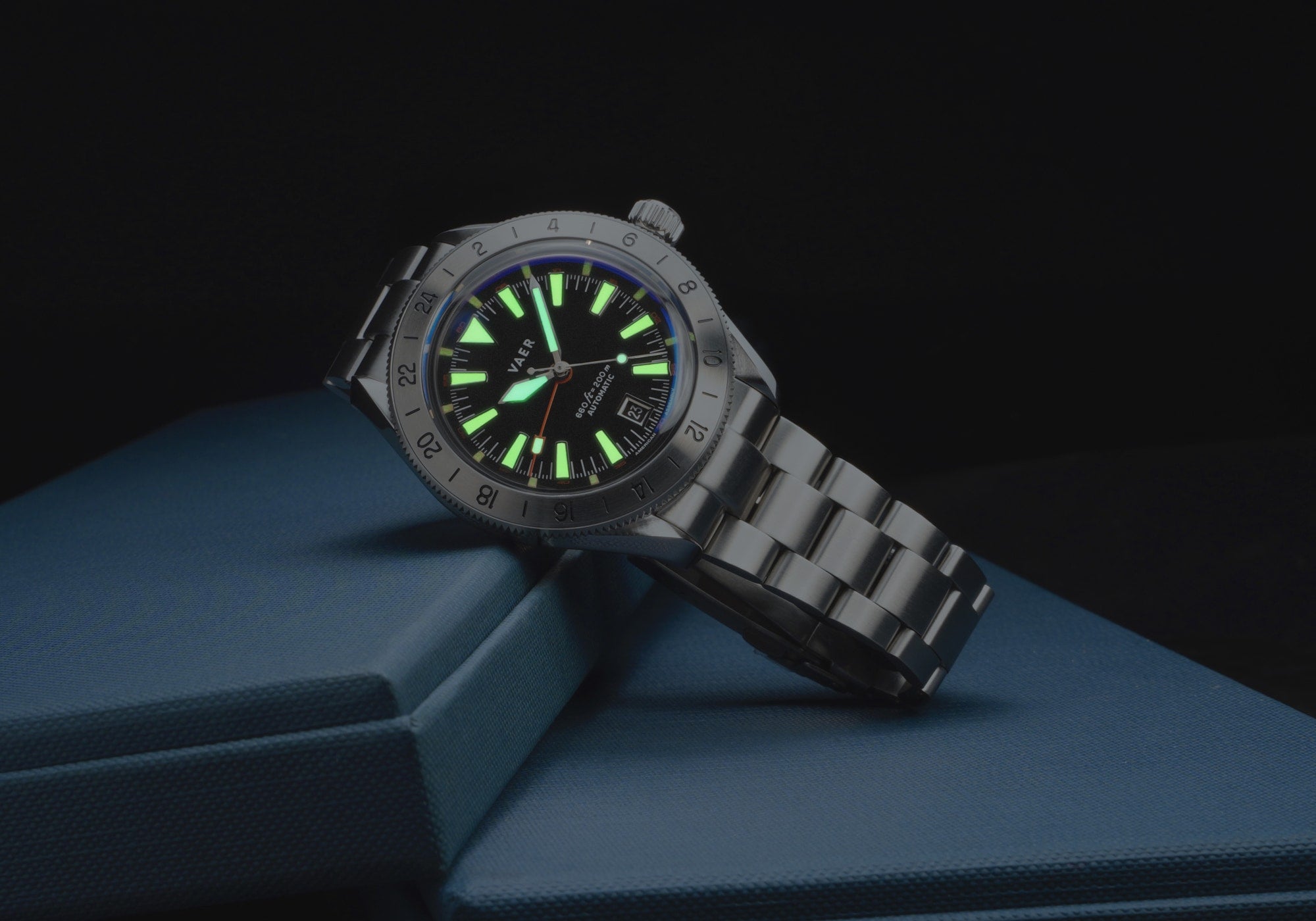 INSPIRATION The G5 Pacific is the GMT version of the Pacific diver (our core dive watch design). In designing that watch, our goal was to pay homage to military history while also further establishing a distinct and modern Vaer aesthetic. This watch's dial design is inspired by the 1971 Rolex Explorer II ref. 1655 and 1950s GMT Master, worn by American Pan Am pilots in the early days of commercial aviation. The dial features Vaer’s distinctive curved trapezoid indices (another hallmark of Vaer dials). The G5 GMT is further distinguished as one of the first Vaer model to use Grade A Old Radium lume paint - the feature that helps it achieve such an incredible night-time glow.