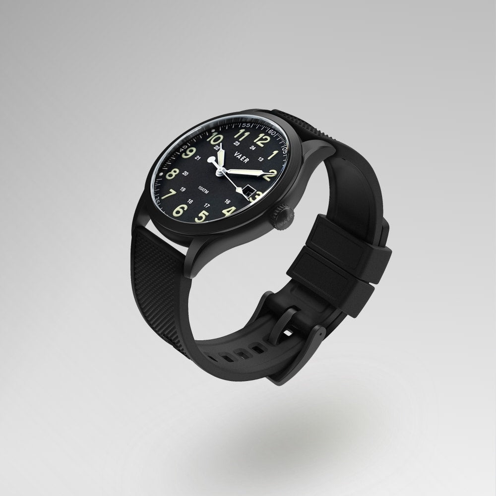SUMMARY The S3 Tactical Field is a military-inspired 10ATM watch, that stands out in the Vaer line-up thanks to its "blacked-out" aesthetic and extremely impressive lume paint performance. As an S3 model, this watch is part of our affordable Standard Issue collection, distinguished by its ocean-ready functionality, low-profile case design, ultra-accurate quartz movement, and entry-level price point.